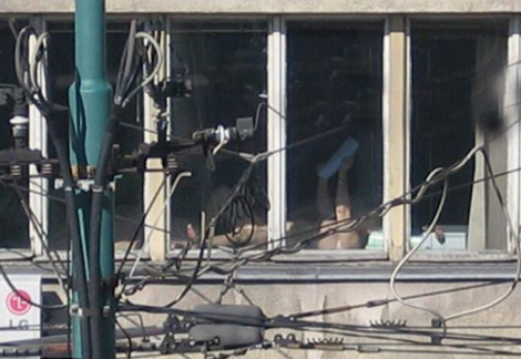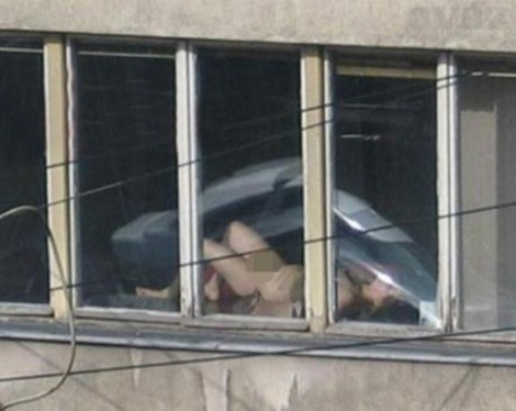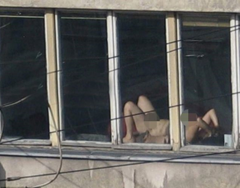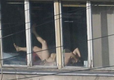 Για κακή της τύχη, εργάτες από το απέναντι κτίριο εντόπισαν το... παράξενο αυτό θέαμα και φυσικά το φωτογράφισαν. Επόμενο βήμα να το ανεβάσουν στο Διαδίκτυο και να την ξεφτιλίσουν παγκοσμίως.