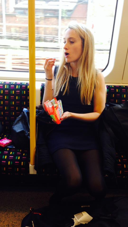 Η σελίδα ονομάζεται «Women Who Eat On Tubes», Γυναίκες που τρώνε στο μετρό και προτείνει στους λονδρέζους, εδώ και μερικές εβδομάδες, ένα περίεργο παιχνίδι. Να φωτογραφίζουν γυναίκες που τρώνε, χωρίς να γίνονται αντιληπτοί και να τις ανεβάζουν μαζί με τα σχετικά σχόλια, τι μασουλάνε, σε ποιά γραμμή, τι ώρα κλπ.